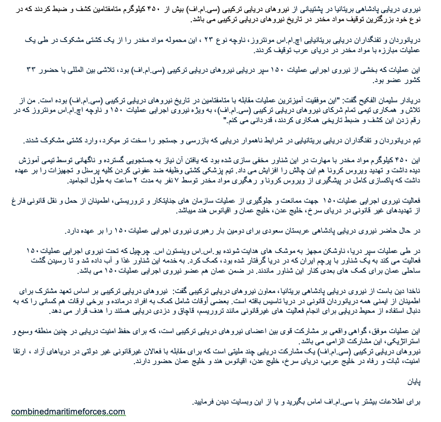 One response to “نیروهای دریایی ترکیبی در بزرگترین توقیف متامفتامین خود بیش از ۴۵۰ کیلوگرم مواد مخدر کشف و ضبط کردند”