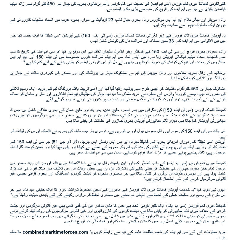 Combined Maritime Forces (CMF) is a 47-nation naval partnership, which exists to promote security, stability and prosperity across approximately 3.2 million square miles of international waters, which encompass some of the world’s most important shipping lanes.