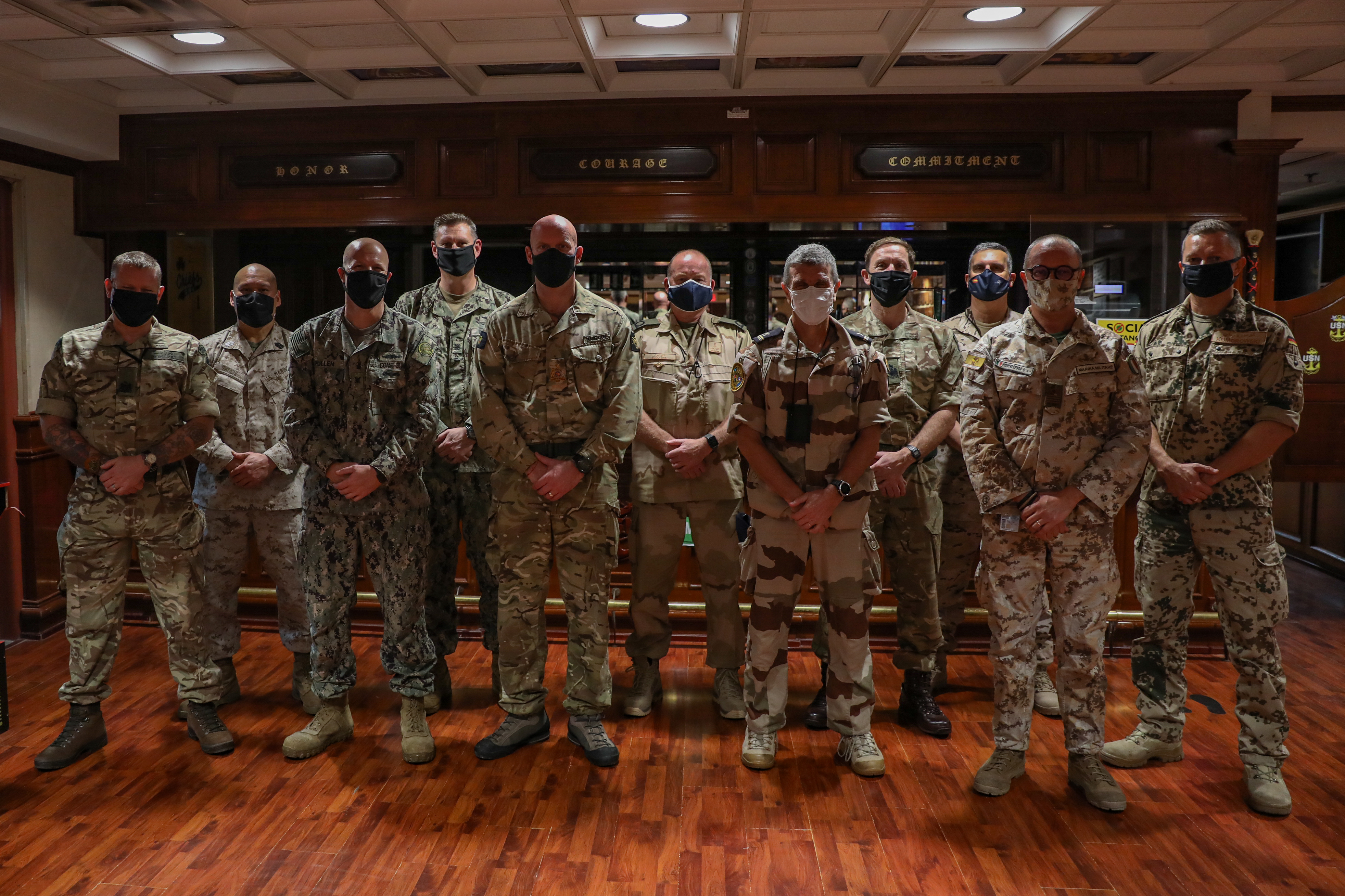 The event began with lunch hosted by CMC Lucas Pullen, the Command Senior Enlisted Leader for CMF and was attended by numerous Master Chiefs and Chiefs or country equivalents from around the world. Four nominative level Senior Enlisted Leaders attended including the SEAC; CMDCM Franklin “Spike” Call, U. S. Navy Fifth Fleet Command Master Chief; SGM Misitupa Tueichi, Sergeant Major, Naval Amphibious Forces TF-51/5th Marine Expeditionary Brigade (51/5); and CMC Pullen of CMF, as well as other units located in the Kingdom of Bahrain. Countries represented included France, Italy, Canada, Turkey, Australia, United Kingdom, United States, Spain, the Kingdom of Saudi Arabia, the Kingdom of Bahrain, Germany, and the Netherlands.