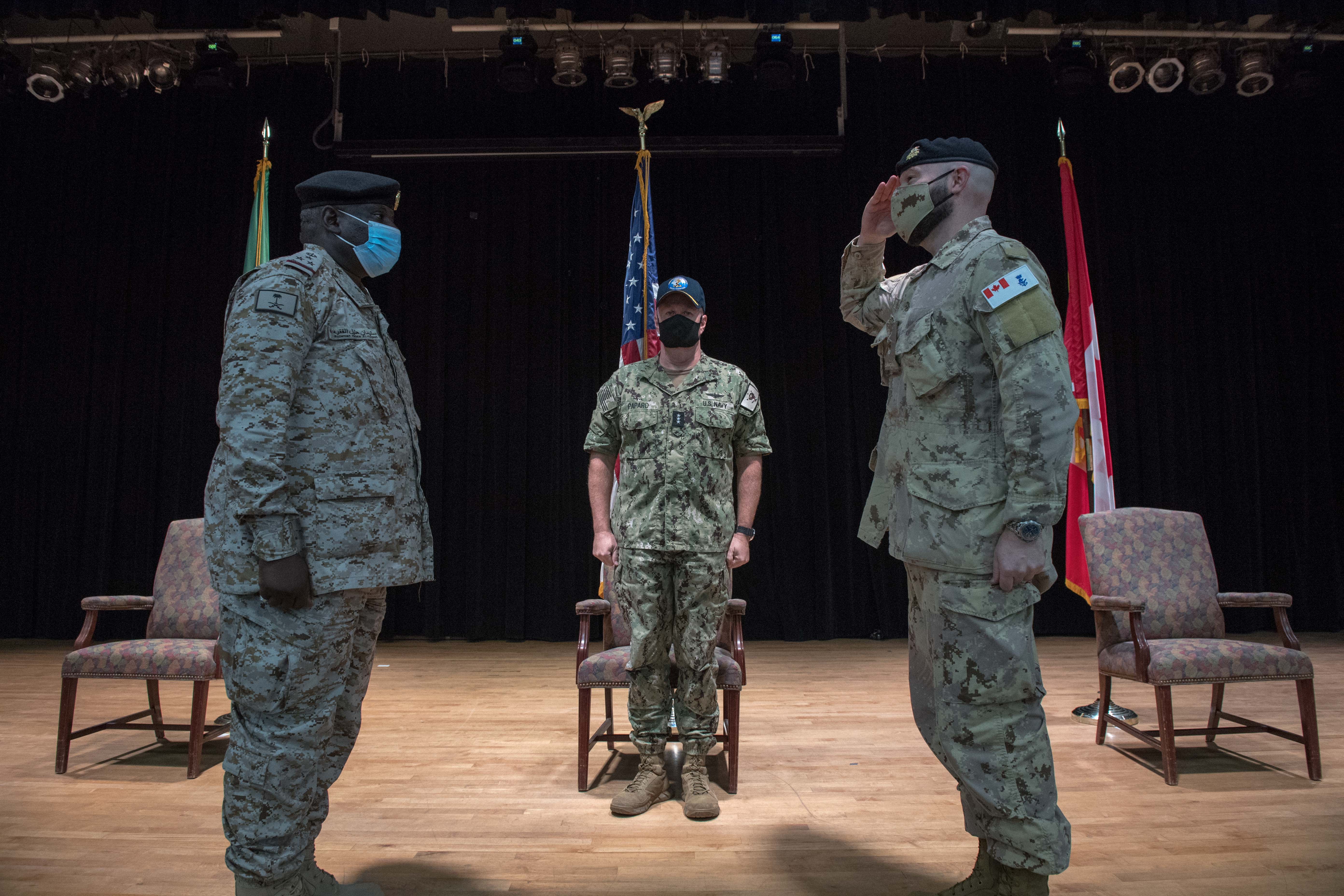 Rear Admiral Sulieman Al Faqeeh of the Royal Saudi Naval Forces has formally handed-over command of Combined Maritime Forces’ (CMF) Combined Task Force (CTF) 150 to Commodore Dan Charlebois of the Canadian Armed Forces (CAF), in a special ceremony held at the US Navy’s NAVCENT headquarters in Bahrain, Jan. 27, 2021.