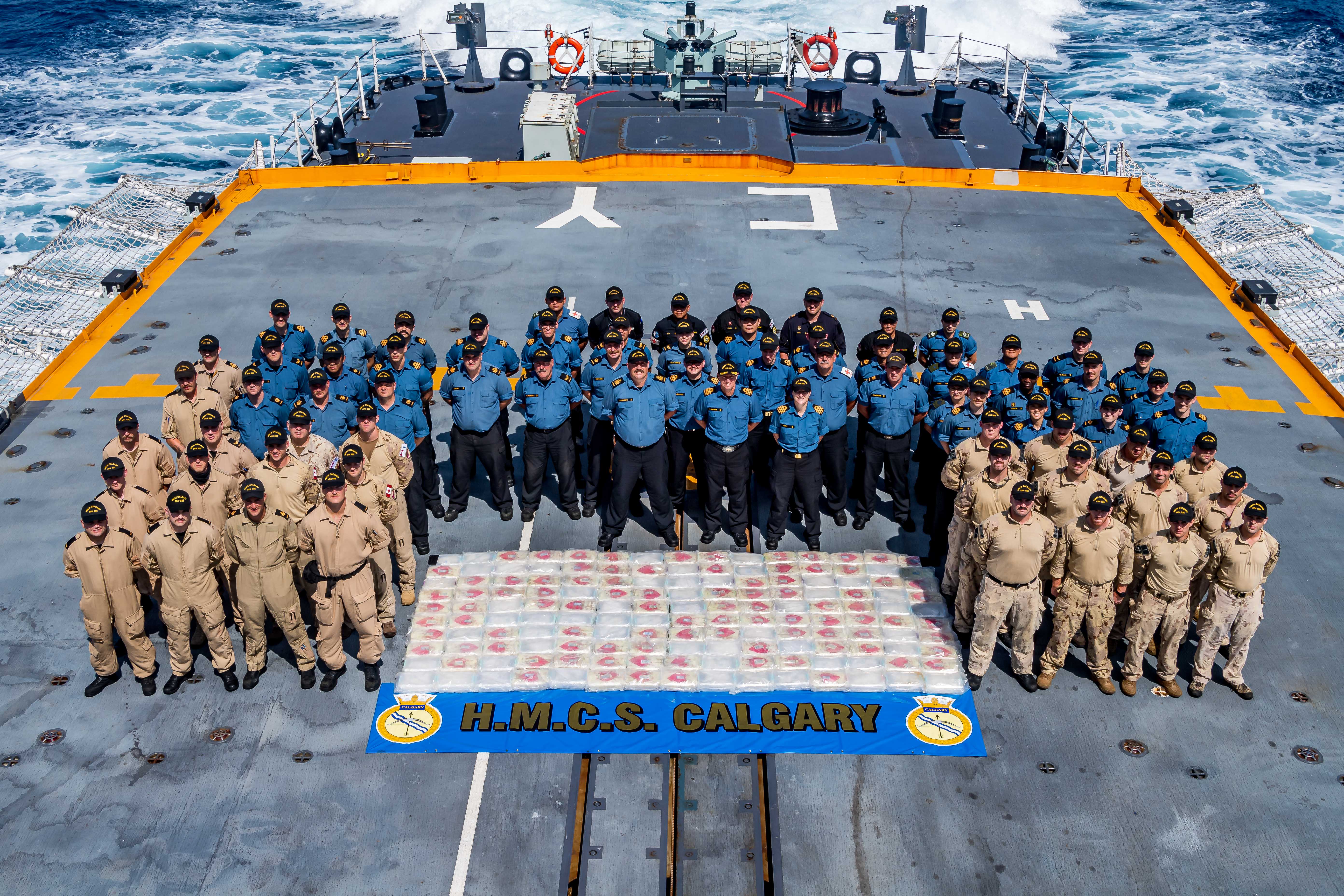 The record-setting haul of 2,835 lbs (1,286 kg) of heroin on 23 April was achieved seven years to the day since HMAS Darwin interdicted 2,275 lbs (1,032kg) of the drug in 2014. In addition to their record-breaking success, Calgary struck again less than 24 hours later with a second interdiction capturing 794 lbs (360 kg) of methamphetamine.