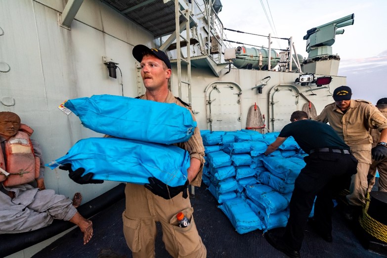 The Royal Canadian Navy (RCN) warship conducted three back-to-back drug interdiction operations on 30 April, seizing 15,071 lbs (6,836 kg) of hashish. Calgary’s operational success continued on 2 May, with a high-value interdiction of 1,146 lbs (520 kg) of methamphetamine, 1,378 lbs (625 kg) of hashish and 11 lbs (5 kg) of heroin. This is the latest in a series of six seizures in just seven days made by Calgary whilst in direct support of CMF’s Canadian-led Combined Task Force (CTF) 150.