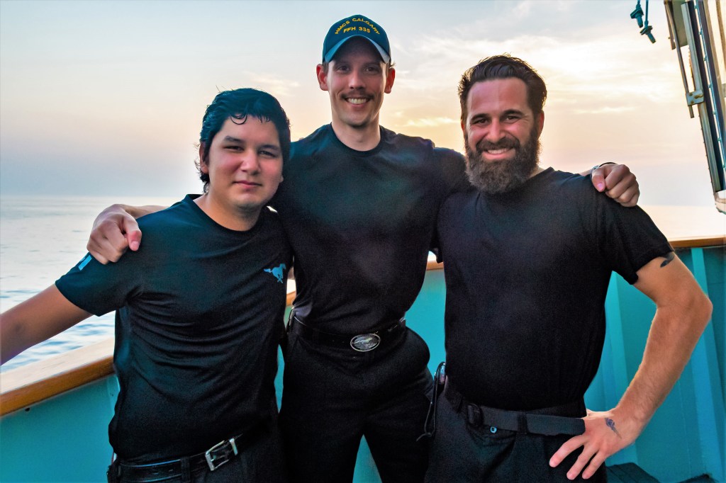 The small boat team was promptly dispatched, and two boatswains spent 15 minutes delicately cutting the tangled mess of lines that had wrapped around the turtle’s body. Once freed, it swam off to join other sea turtles that were circling the floating debris along with a large school of yellow tuna.