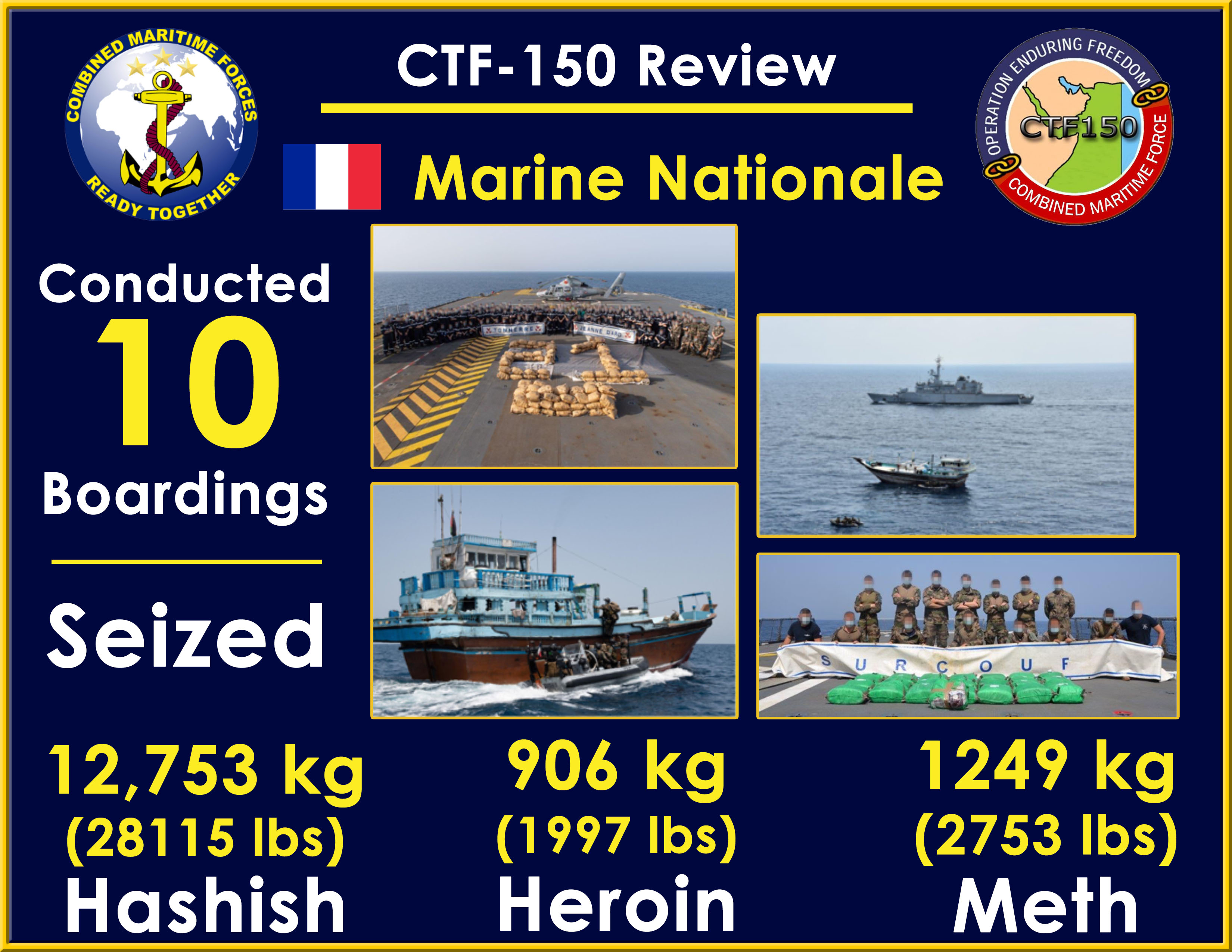 The numbers in terms of total interdictions are impressive: 78,555 lbs (35,632 kg) of hashish; 8,973 lbs (4,070 kg) of heroin; and a stunning 6,762 lbs (3,067 kg) of methamphetamine, a narcotic whose presence is emerging in regional smuggling circuits. Together, these operations have interdicted over $143.6 million dollars of narcotics, the proceeds of which are linked to the financing of regional terrorist and criminal organizations in the CMF area of operations.