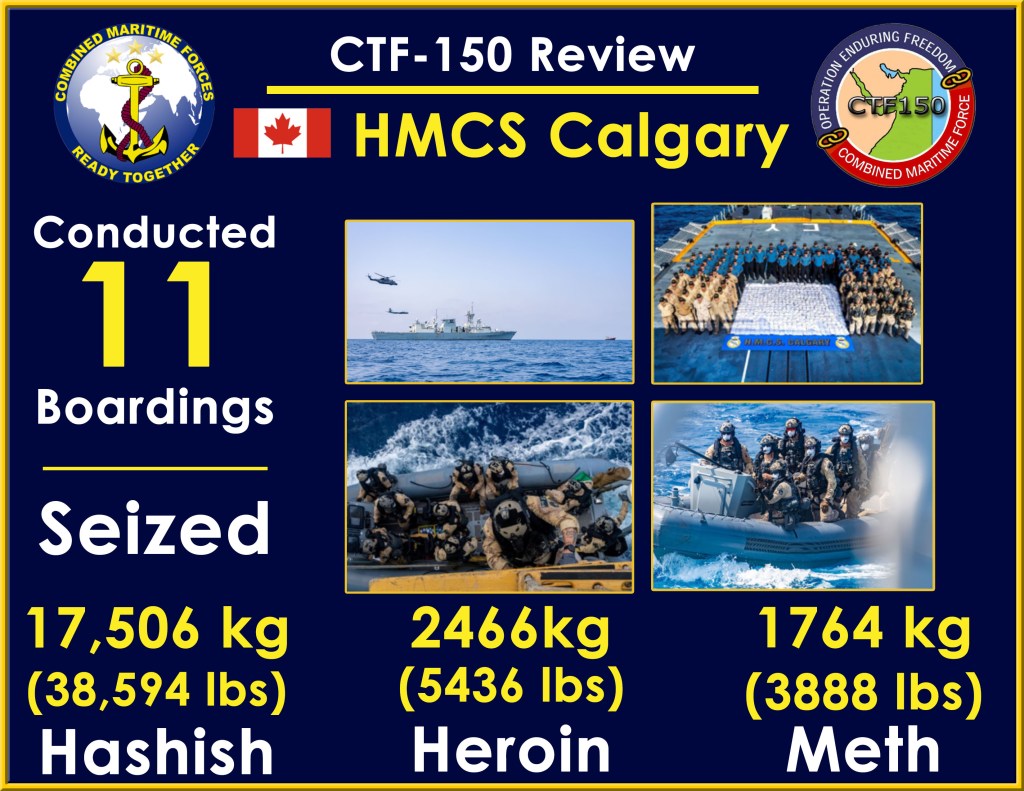 | 11 May, 2021 | HMCS Calgary, Royal Canadian Navy | Hashish and Methamphetamine | 13,003 lbs Hashish, 831 lbs Methamphetamine (5,898 kg Hashish, 377 kg Methamphetamine) |