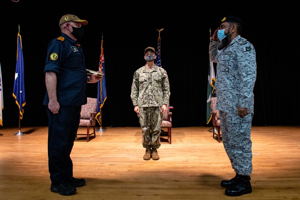 220118-N-KZ419-1056 NAVAL SUPPORT ACTIVITY BAHRAIN (Jan. 18, 2022) Vice Adm. Brad Cooper, commander of U.S. Naval Forces Central Command, U.S. 5th Fleet and Combined Maritime Forces (CMF), center, presides over the change of command between Royal New Zealand Navy Capt. Brendon Clark outgoing Combined Task Force (CTF) 150 commander, left, and Pakistan Navy Commodore Vaqar Muhammad, incoming CTF 150 commander during a change of command ceremony onboard Naval Support Activity Bahrain, Jan. 18. CTF 150 is one of three task forces under CMF and conducts maritime security operations outside the Arabian Gulf to ensure legitimate commercial shipping can transit the region free from non-state threats. (U.S. Navy photo by Mass Communication Specialist 2nd Class Dawson Roth)
