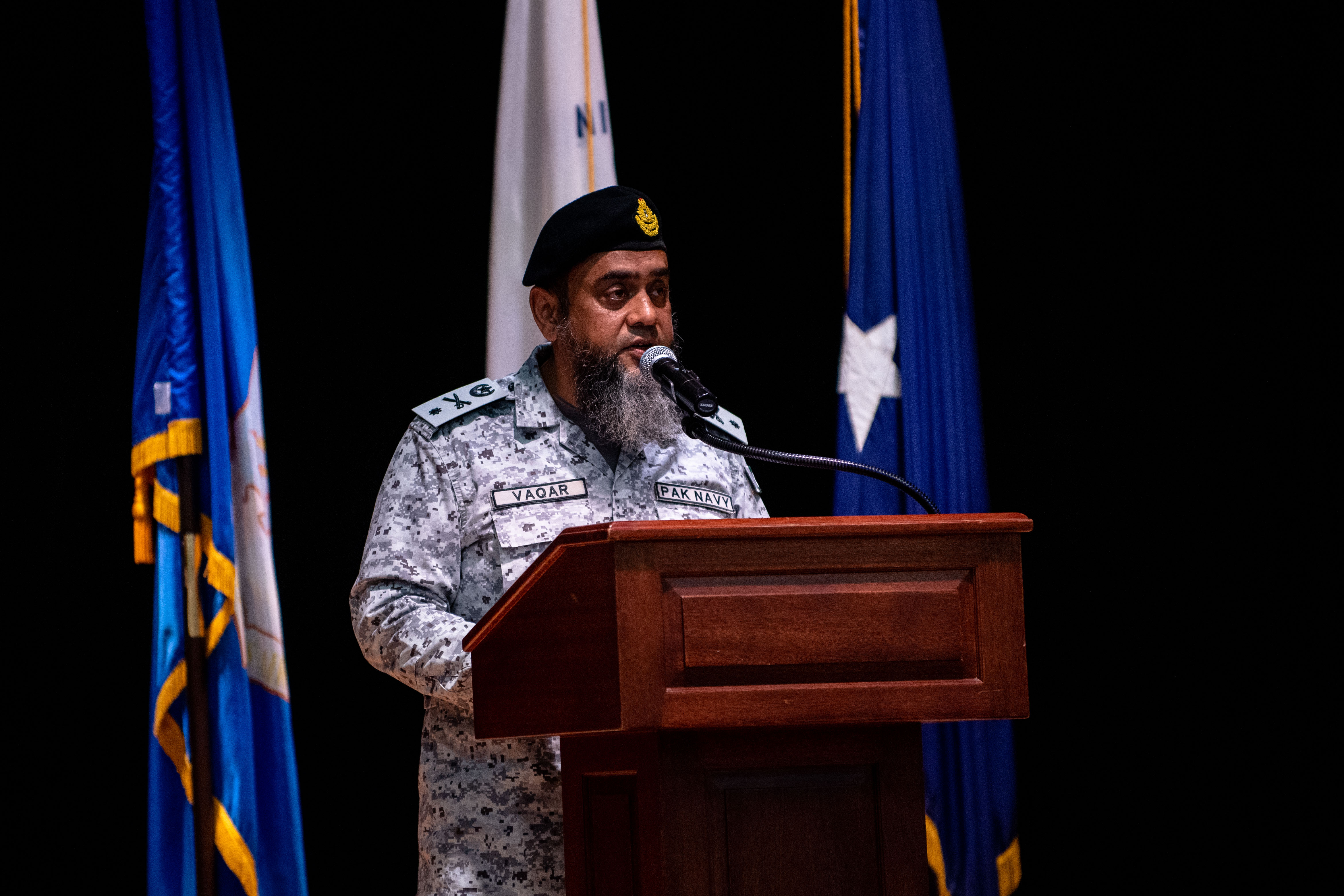 220118-N-KZ419-1106 NAVAL SUPPORT ACTIVITY BAHRAIN (Jan. 18, 2022) Pakistan Navy Commodore Vaqar Muhammad, incoming Combined Task Force (CTF) 150 commander speaks during the CTF 150 change of command ceremony onboard Naval Support Activity Bahrain, Jan. 18. CTF 150 is one of three task forces under CMF and conducts maritime security operations outside the Arabian Gulf to ensure legitimate commercial shipping can transit the region free from non-state threats. (U.S. Navy photo by Mass Communication Specialist 2nd Class Dawson Roth)