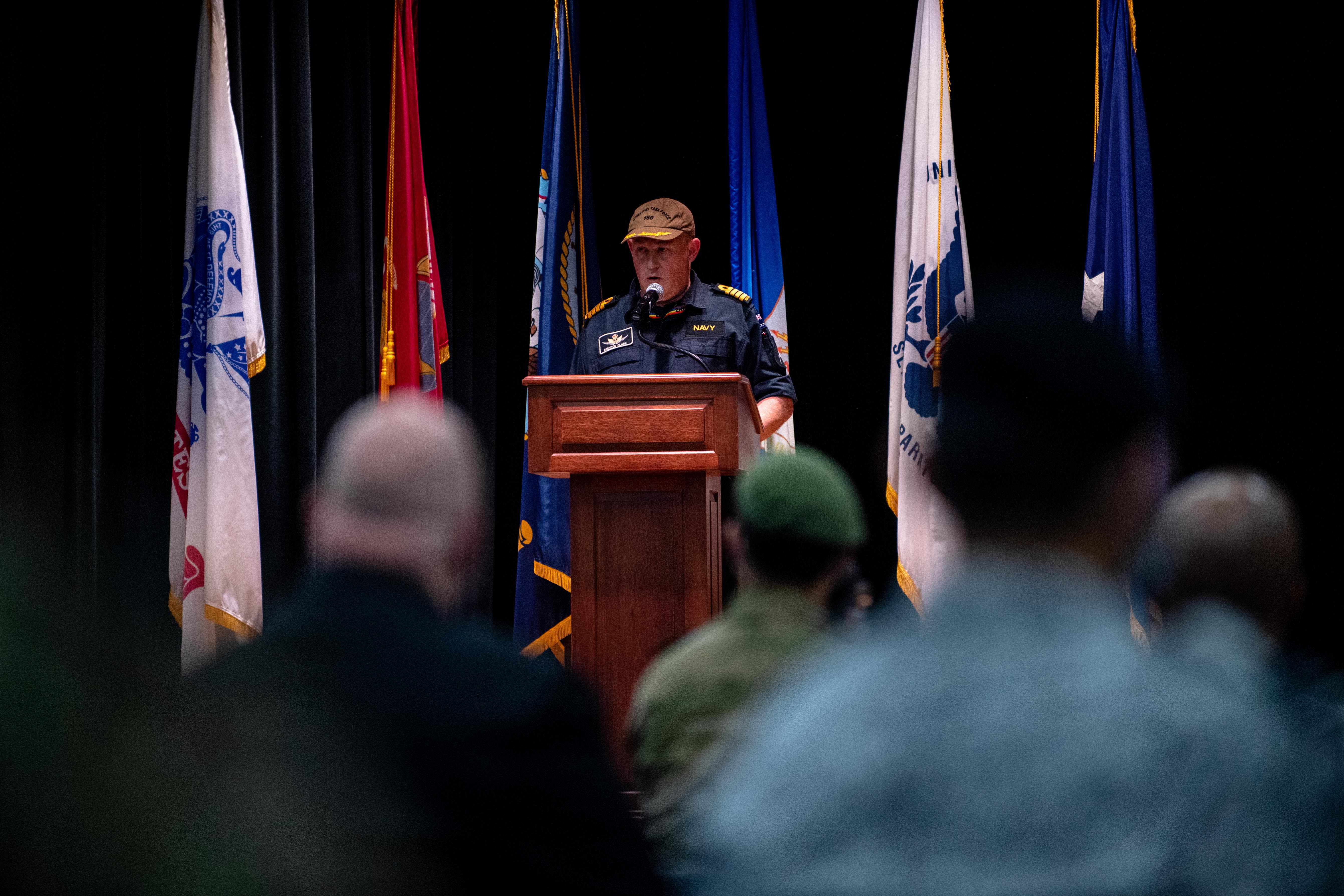 220118-N-KZ419-1048 NAVAL SUPPORT ACTIVITY BAHRAIN (Jan. 18, 2022) Royal New Zealand Navy Capt. Brendon Clark outgoing Combined Task Force (CTF) 150 commander, speaks during the CTF 150 change of command ceremony onboard Naval Support Activity Bahrain, Jan. 18. CTF 150 is one of three task forces under Combined Maritime Forces and conducts maritime security operations outside the Arabian Gulf to ensure legitimate commercial shipping can transit the region free from non-state threats. (U.S. Navy photo by Mass Communication Specialist 2nd Class Dawson Roth)