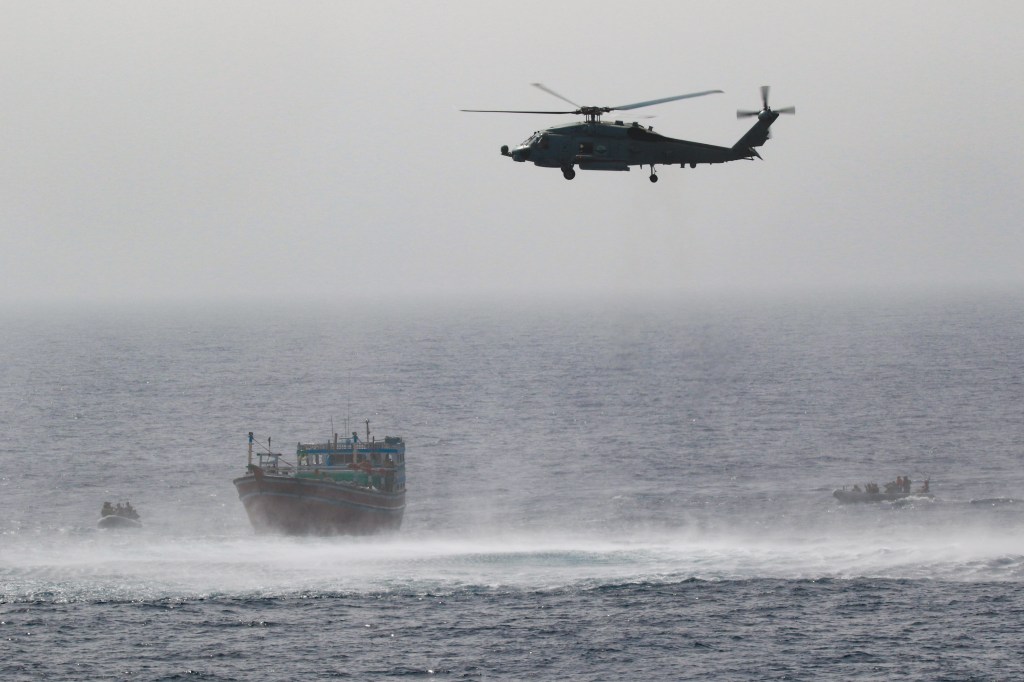 GULF OF OMAN (May 16, 2022) An MH-60R Seahawk from Helicopter Maritime Strike Squadron (HSM) 35, Detachment 1, provides aerial support to an interdiction team from guided-missile destroyer USS Momsen (DDG 92) approaching a fishing vessel May 16. The vessel was seized while transiting international waters in the Gulf of Oman. (U.S. Navy photo by Mass Communication Specialist 3rd Class Lily Gebauer)
