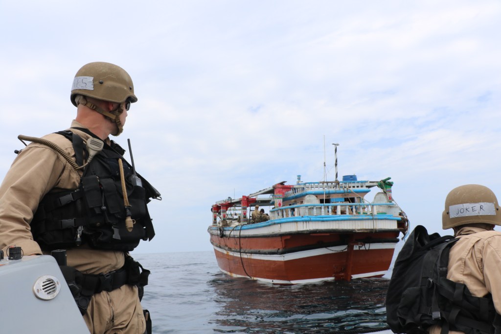 230421-N-NO146-1003 GULF OF OMAN (April 21, 2023) Members of a boarding team from guided-missile destroyer USS Paul Hamilton (DDG 60) interdict a fishing vessel in the Gulf of Oman, April 21, 2023. The vessel was seized while attempting to smuggle illicit drugs. (U.S. Navy photo)