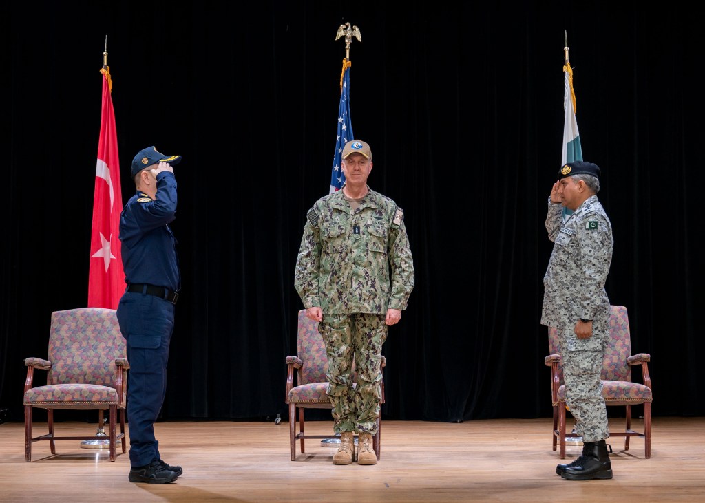 Türkiye Navy Rear Admiral Rustu Sezer turned over command of Combined Task Force (CTF) 151 to Pakistan Navy Commodore Sohail Azmie.