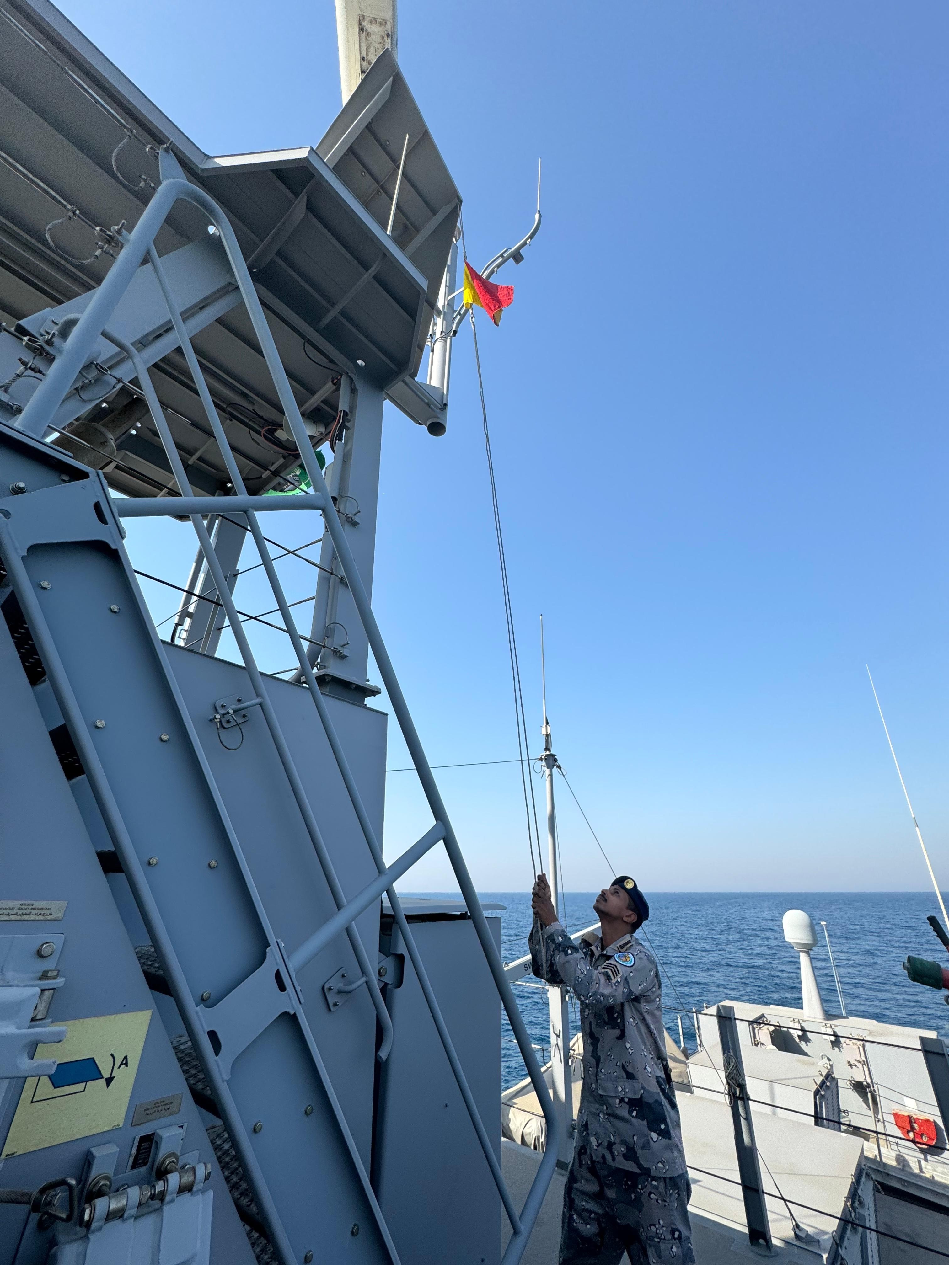 The Royal Saudi Naval Forces and Saudi Border Guard initiated the Search and Rescue Exercise, focusing on responding to a Man Overboard (MoB) report and launching a small-scale Search and Rescue operation. Two RSNF and SBG vessels positioned themselves three Nautical Miles apart. Vessel One would then launch a simulation dummy and relay the approximate location to their partner vessel in real-time. Vessel Two would respond to the MoB report and sail toward the area to commence a search. Once the dummy was sighted, Vessel Two would recover it by launching a small sea boat or by close maneuvering the ship and collecting the dummy over the side of the vessel. This real-time communication was crucial in strengthening the effective communication skills between units and CTF152.